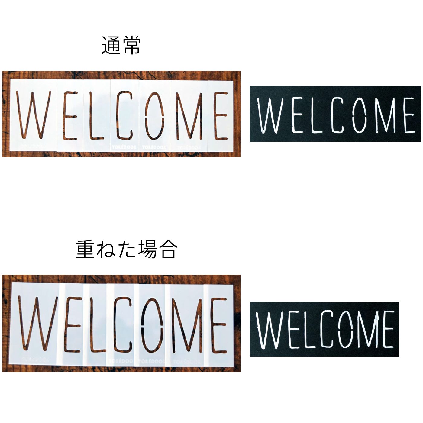 「WELCOME」など、「E」を2回使う時も一度にステンシルできて便利!